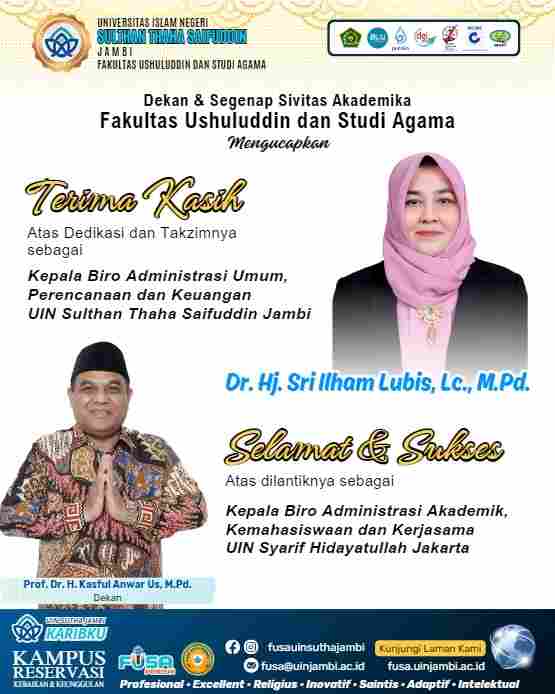 Prof. Dr. H. Kasful Anwar.Us, M.Pd selaku Dekan Fakultas Ushuluddin Dan Studi Agama (FUSA) UIN Sulthan Thaha Saifuddin Jambi turut hadir dalam kegiatan UIN Sulthan Thaha Saifuddin (STS) Jambi menggelar acara perpisahan Kepala Biro AUPKK, Dr. Sri Ilham Lubis, Lc, M.Pd.I bertemapt Ampiteather Lt.4 gedung rektorat UIN STS Jambi, jum’at