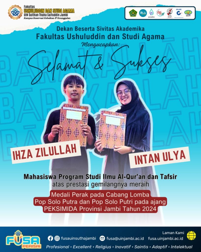 Ajang Pekan seni Mahasiswa Daerah( Peksimida) tahun 2024 bertempat di kampus UNJA dan UIN, Dua Mahasiswa Ilmu Al-Qur’an dan Tafsir Fakultas Ushuluddin dan Studi Agama (FUSA) dapat meraih mendali Perak pada cabang POP Solo Putra Ihza Zilullah (301220041) dari prodi Ilmu Al-Qur’an dan Tafsir.dan Pop Solo Putri Intan Ulya (301230083) dari prodi Ilmu Al-Qur’an dan Tafsir