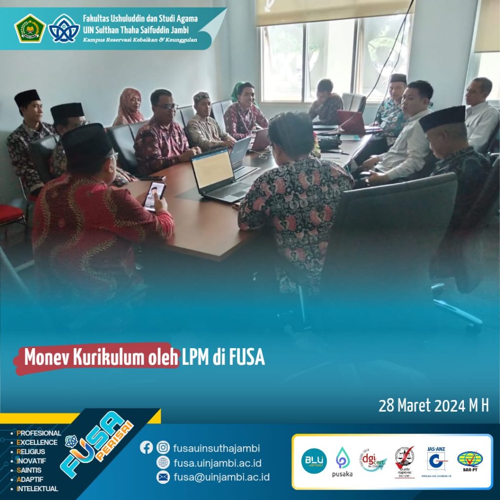 Kamis, 28 Maret 2024, bertempat di ruang meeting lantai 2 Fakultas Ushuluddin dan Studi Agama UIN Sultan Thaha Saifuddin Jambi, team dari LPM yang dikomandoi oleh Sekretaris LPM, bapak Drs. Sururuddin, M.PdI melakukan kegiatan Monev Kurikulum terhadap prodi IAT, ILHA, SAA, AFI dan PPI. Dalam kesempatan ini selain melakukan monev kurikulum juga terhadap tracer study dan Integrasi moderasi beragama.