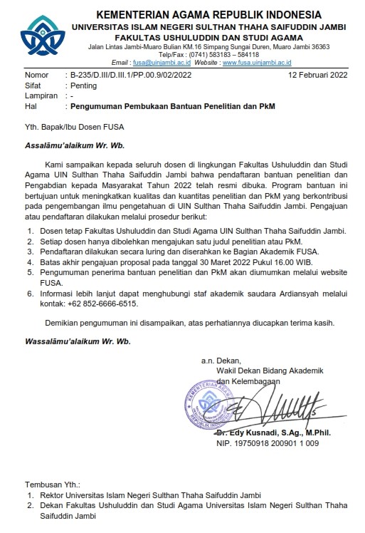 Beranda / Pengumuman / Pengumuman Pembukaan Bantuan Penelitian dan Pengabdian kepada Masyarakat FUSA Tahun 2022
