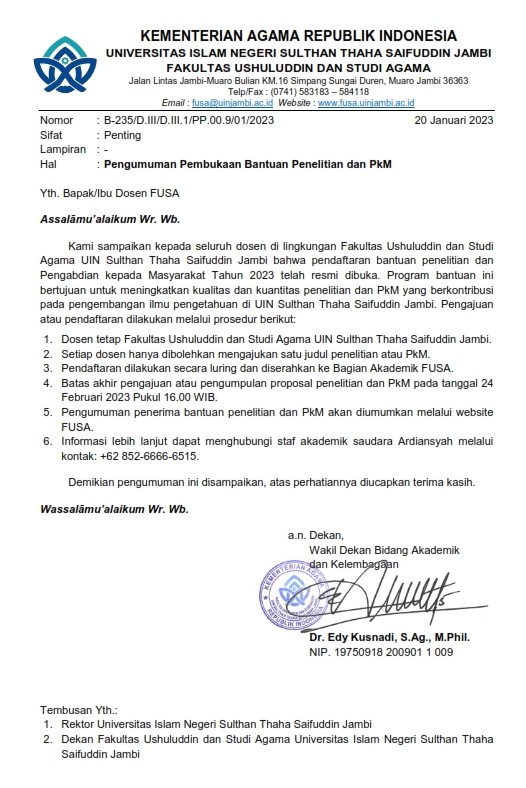 Beranda / Pengumuman / Pengumuman Pembukaan Bantuan Penelitian dan Pengabdian kepada Masyarakat FUSA Tahun 2023
