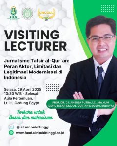 Fusa online – Fakultas Ushuluddin, Adab, dan Dakwah (FUAD) UIN Sjech M. Djamil Djambek Bukittinggi kembali menyelenggarakan kegiatan akademik bertajuk Visiting Lecturer pada Selasa (29/4/2025). Bertempat di aula fakultas, kegiatan ini mengangkat tema menarik: “Jurnalisme Tafsir Al-Qur`an: Peran Aktor, Limitasi, dan Legitimasi Modernisme di Indonesia.” Narasumber utama dalam kegiatan ini adalah Prof. Dr. D.I. Ansusa Putra, Lc., MA.Hum, Guru Besar Ilmu Al-Qur’an dan Sosial Budaya dari UIN Sulthan Thaha Saifuddin Jambi.